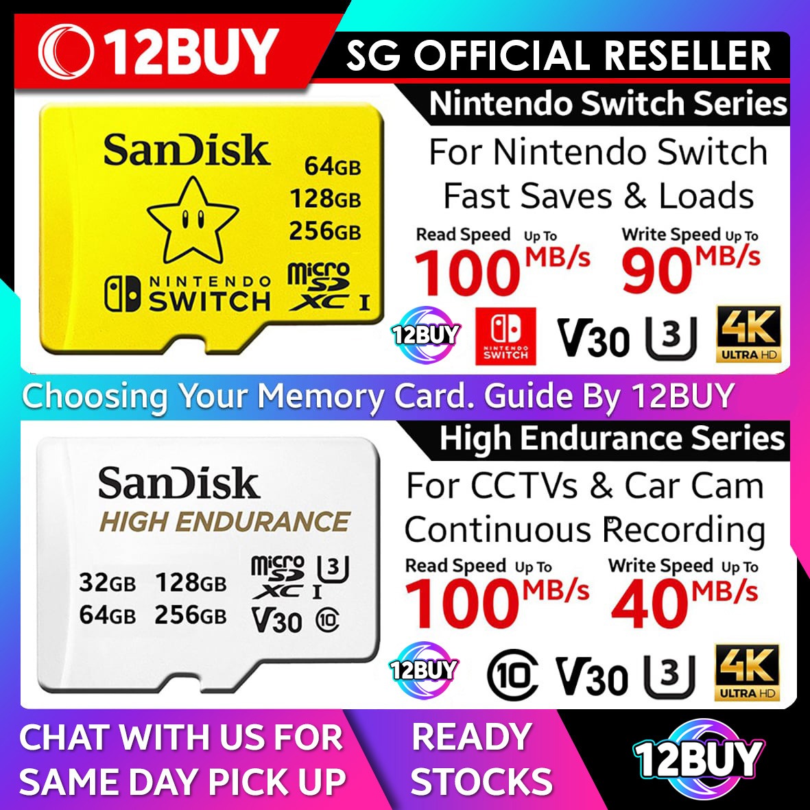SanDisk Nintendo Switch microSD Card 4k U3 V30 UHS-I C10 100MB/s Read Speed 90MB/s Write Speed 64GB 128GB 256GB 512GB QXAT QXAO 12BUY.MEMORY