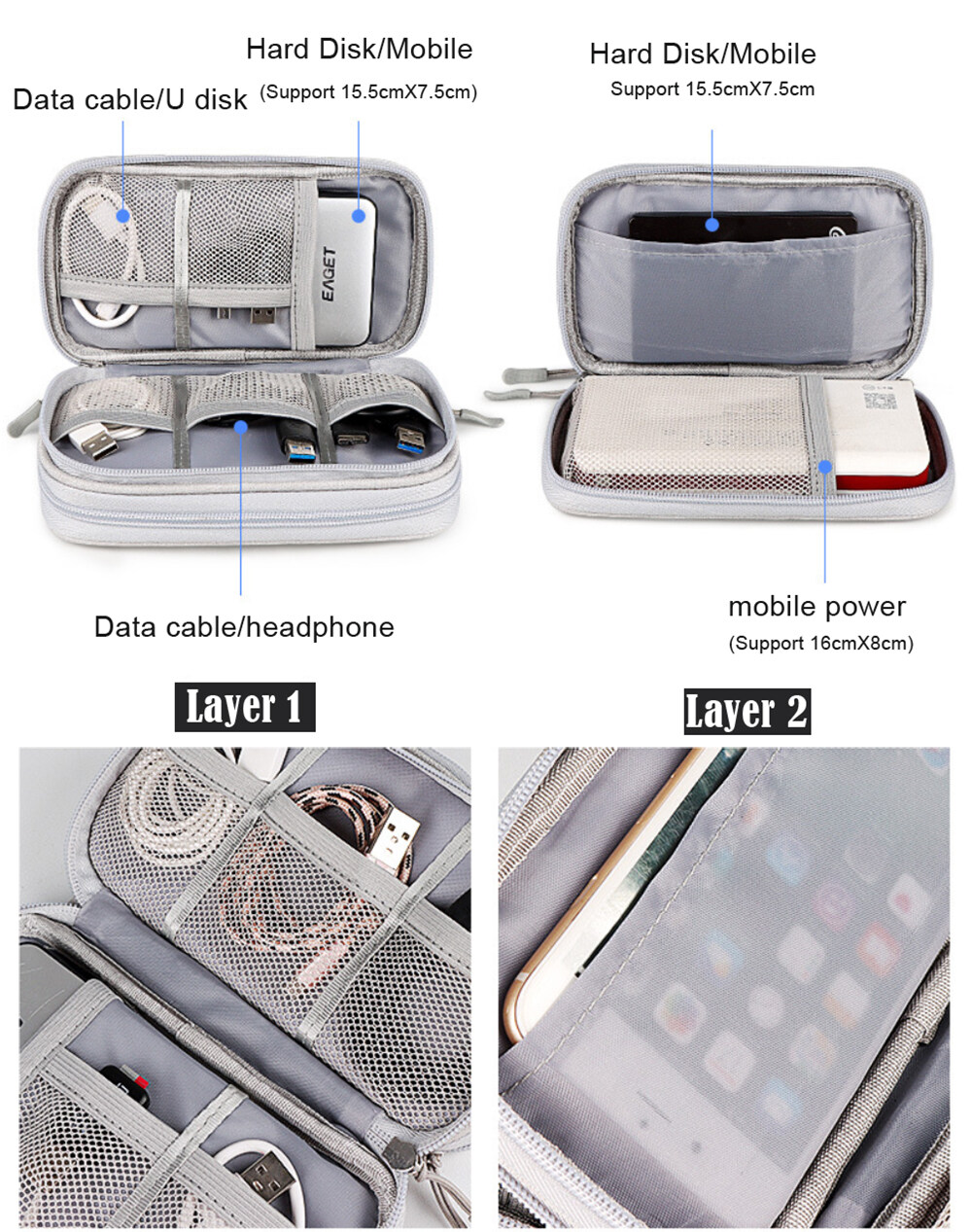Lune Electronic Organizer Bag Power Bank Pouch 2 layers Large Capacity Storage Bag for Mobile power, Electronic Accessories USB Cable Charger Traveling Storage Bags