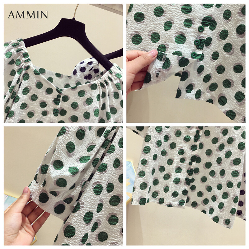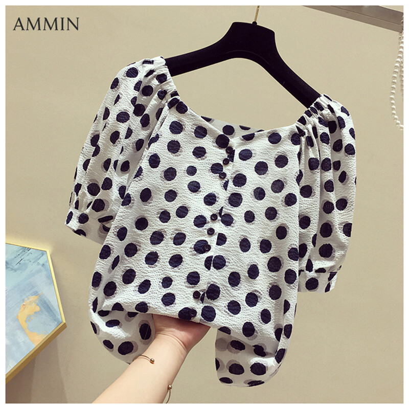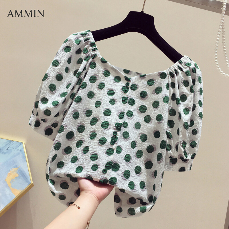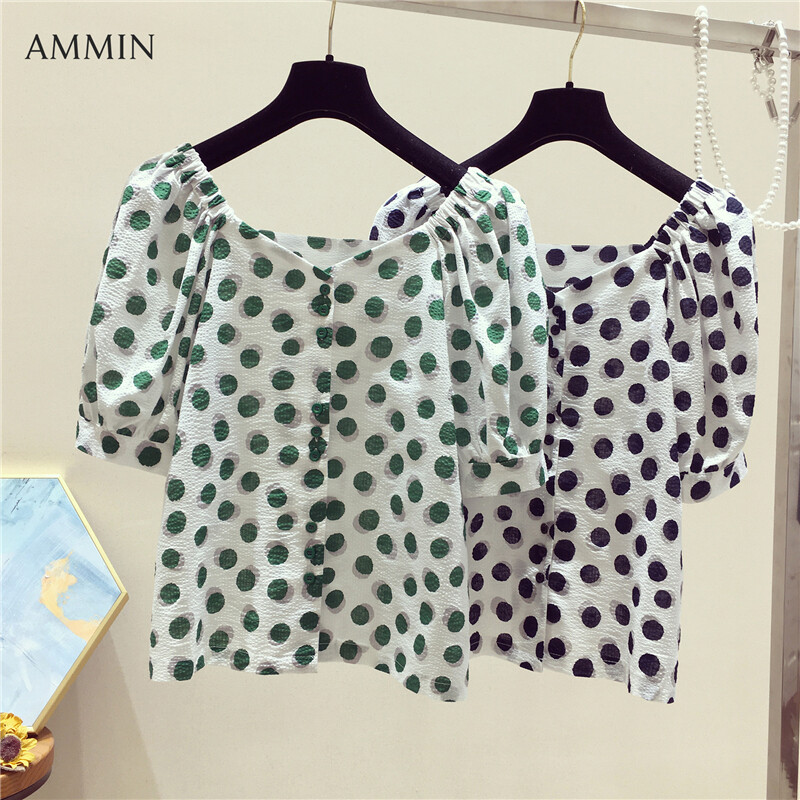 AMMIN Tops 2021 new Korean style boat neck polka dot print puff sleeve chiffon shirt short sleeve women's summer button embellishment short sleeve loose short style elegant temperament blouse