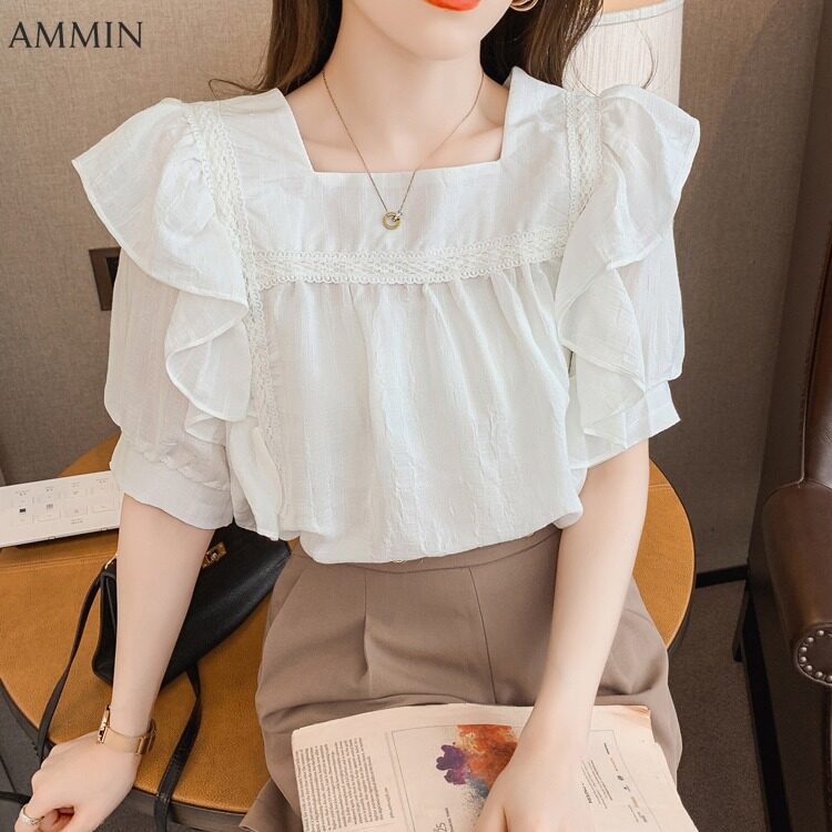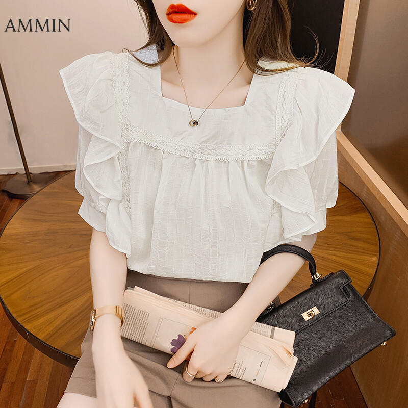 AMMIN Tops 2021 summer new style square neck puff sleeve embroidery hollow lace stitching blouse women's elegant temperament personality design French loose pleated ruffle stitching short style chiffo