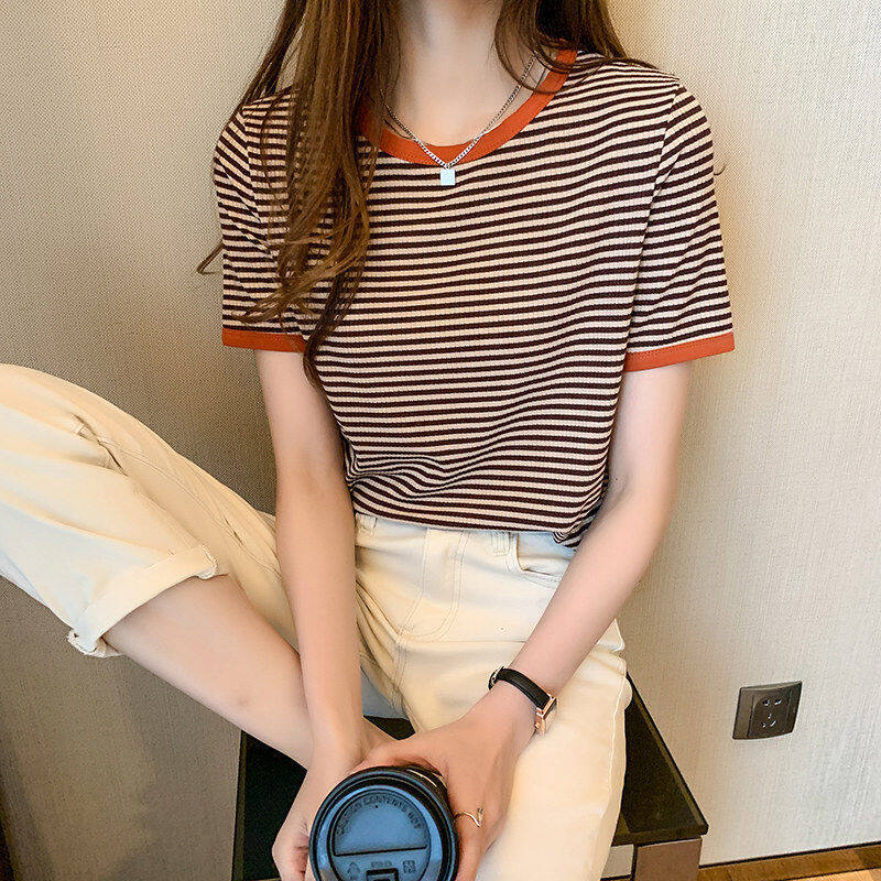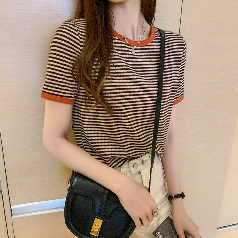 Yes-fashion T Shirt for Women Short Sleeve Casual Plus Size Korean Style Breathable Round Neck Stripes Shirts Loose Printed Tee Home Clothing Tops 0318