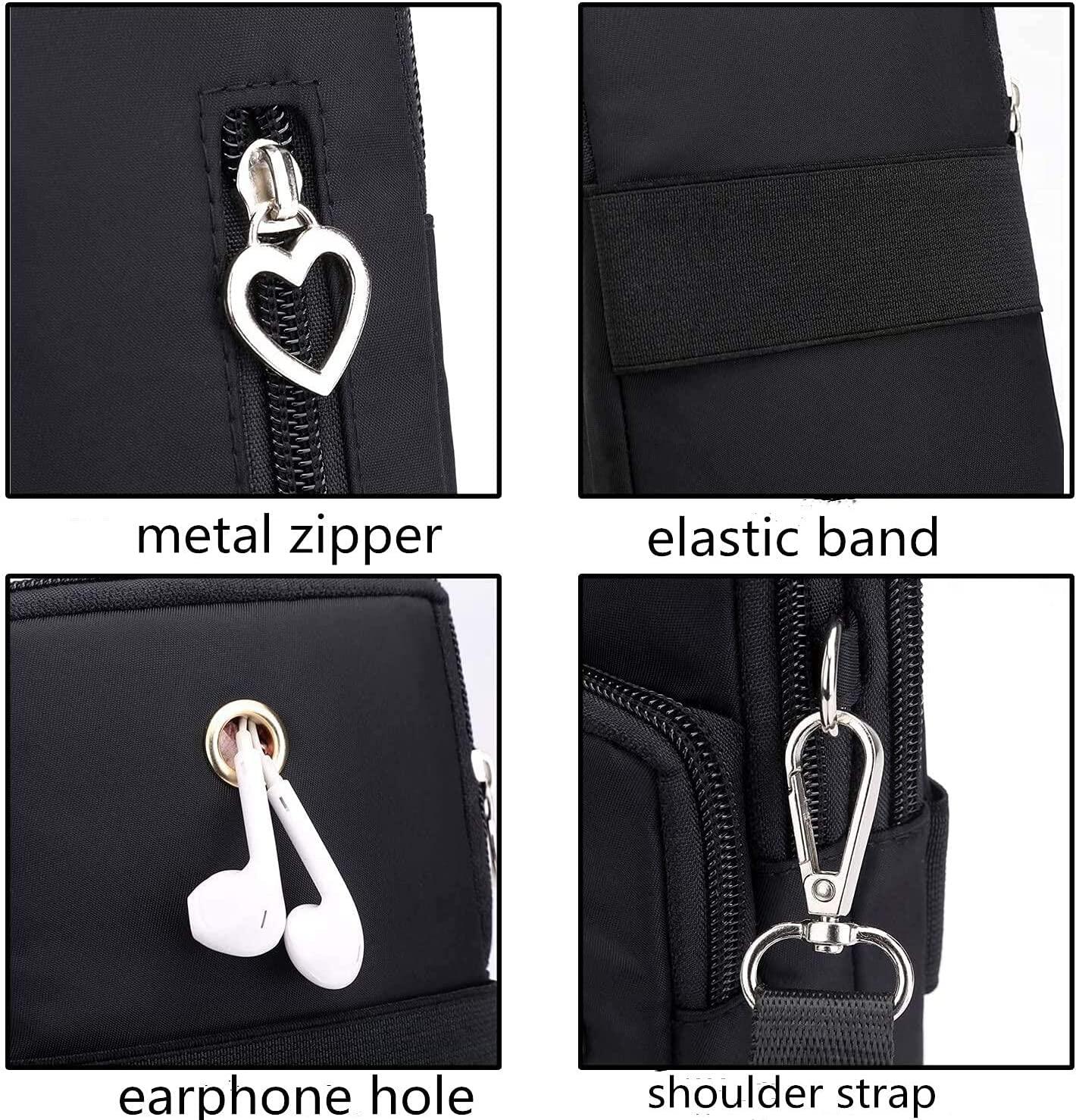 4 outer zipper pocket + 1 adjustable & detachable shoulder strap + 1 back armband + one back earphone hole + metal zipper closure