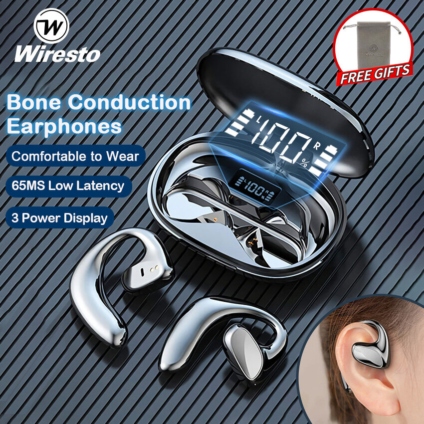 Wiresto TWS Bluetooth Earphone Bone Conduction Bluetooth Headset Ear hook Headphones LED Display 65ms Low Latency Gaming Earbuds Open Ear Wireless Headset HD Stereo Waterproof Sweat-proof