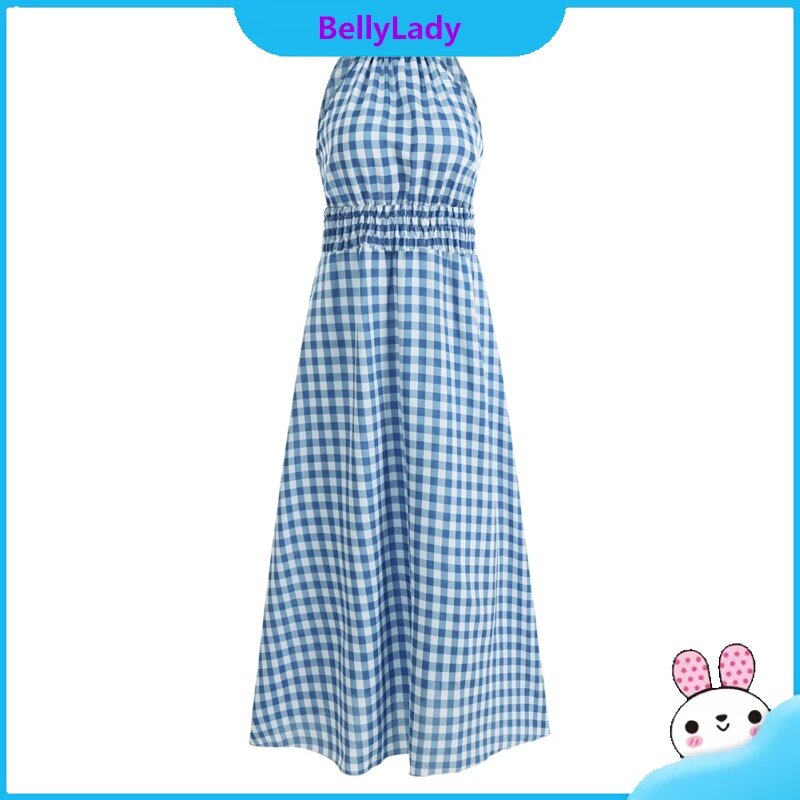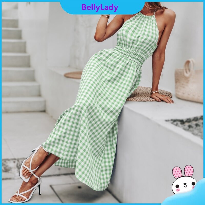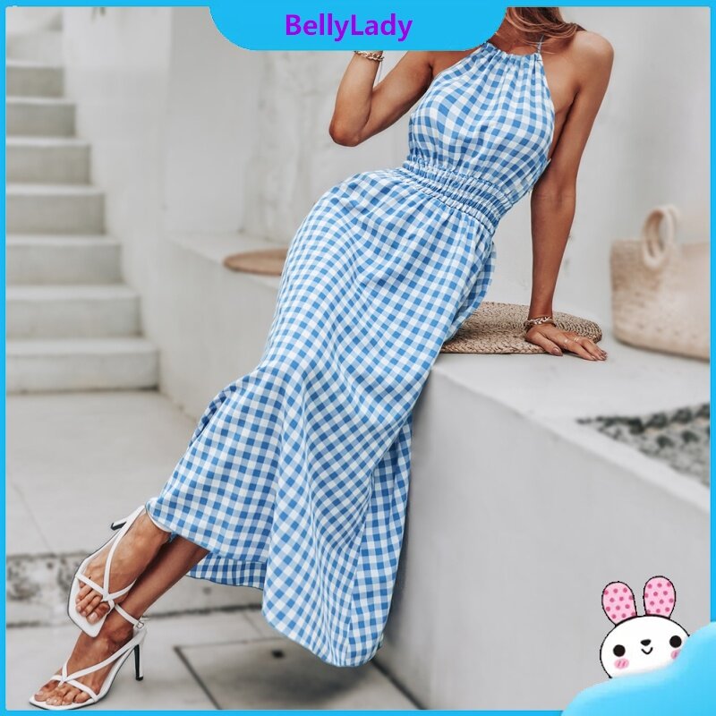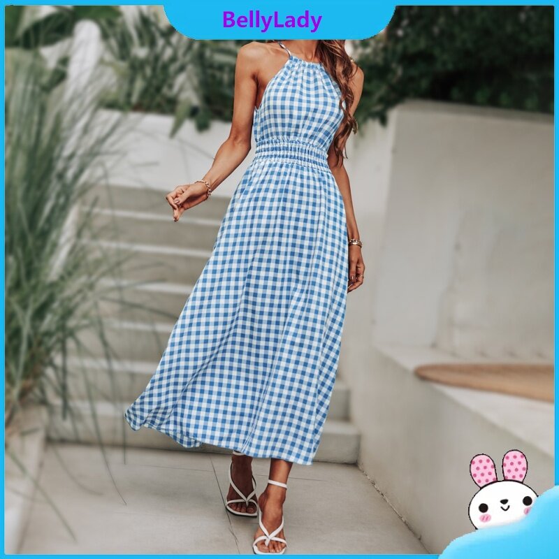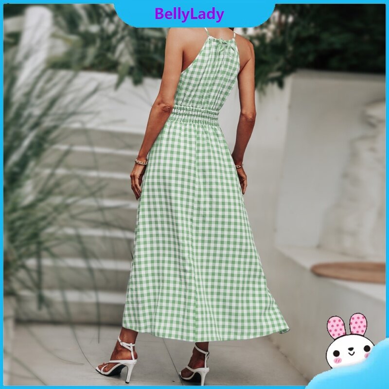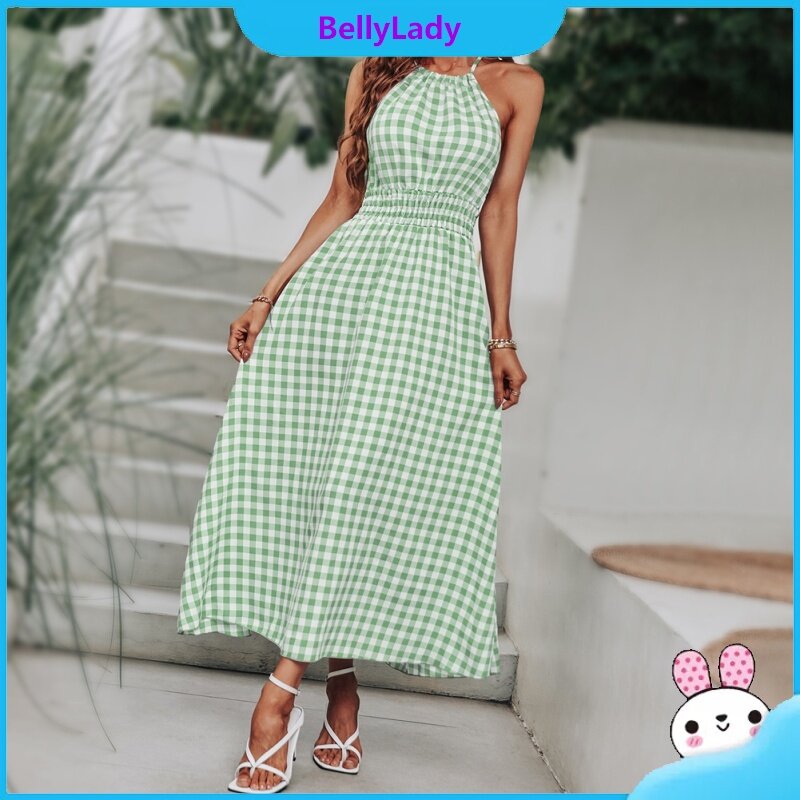 Women Summer Dress Sleeveless Waist-in Suspender Long Skirt Stylish Plaid Printing Dress