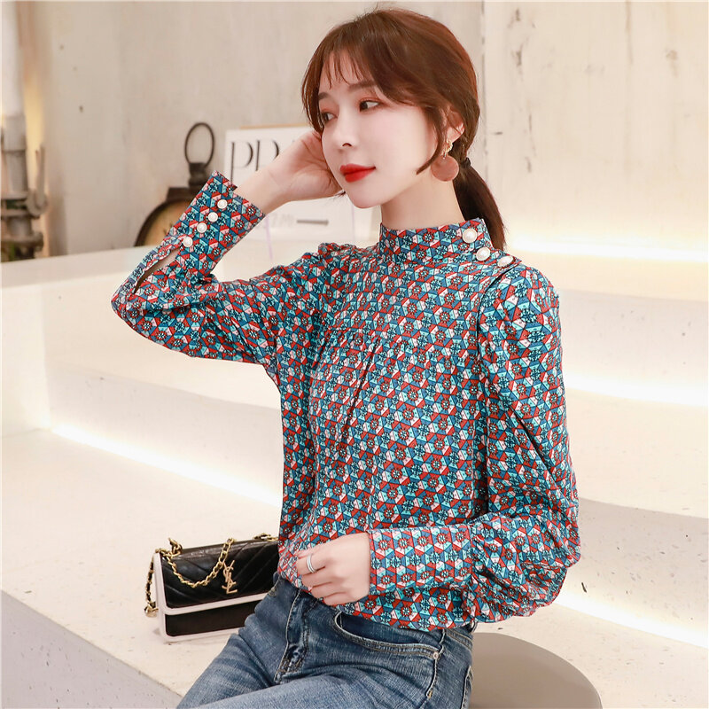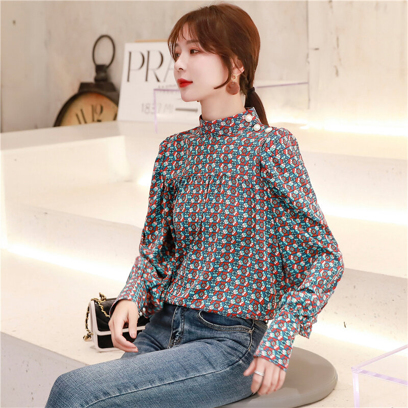 AFEG new Korean Women long sleeve retro print casual fashion wild temperament elegant blouses
